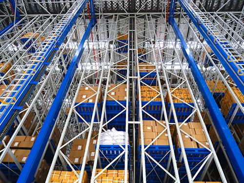 The warehouse has an inbound and outbound efficiency of 127 pallets per hour, with automatic film wrapping before storage.